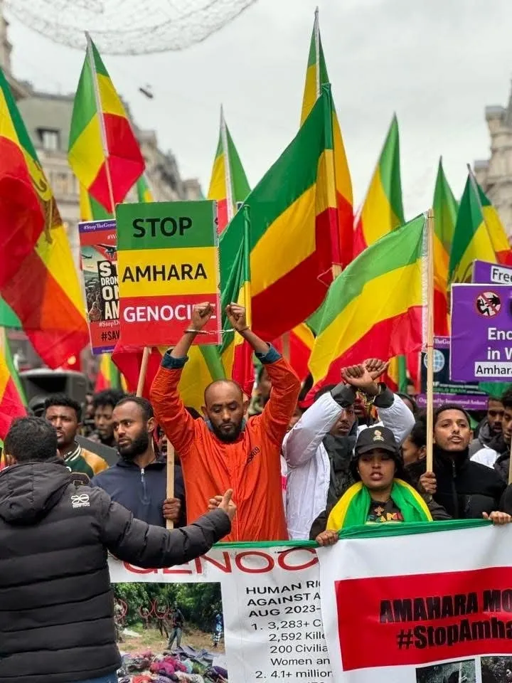 Ethiopians living in the United Kingdom held a massive protest in London, raising their voices against the ongoing Amhara genocide in Ethiopia. The demonstration brought together thousands of Ethiopians who called for justice, peace, and an end to the atrocities.